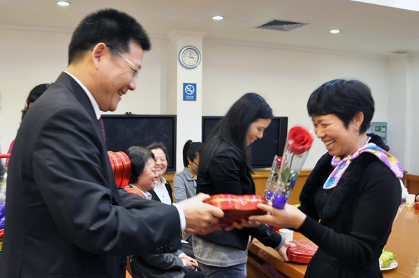 仲伟合校长向与会女代表赠送玫瑰花及巧克力
